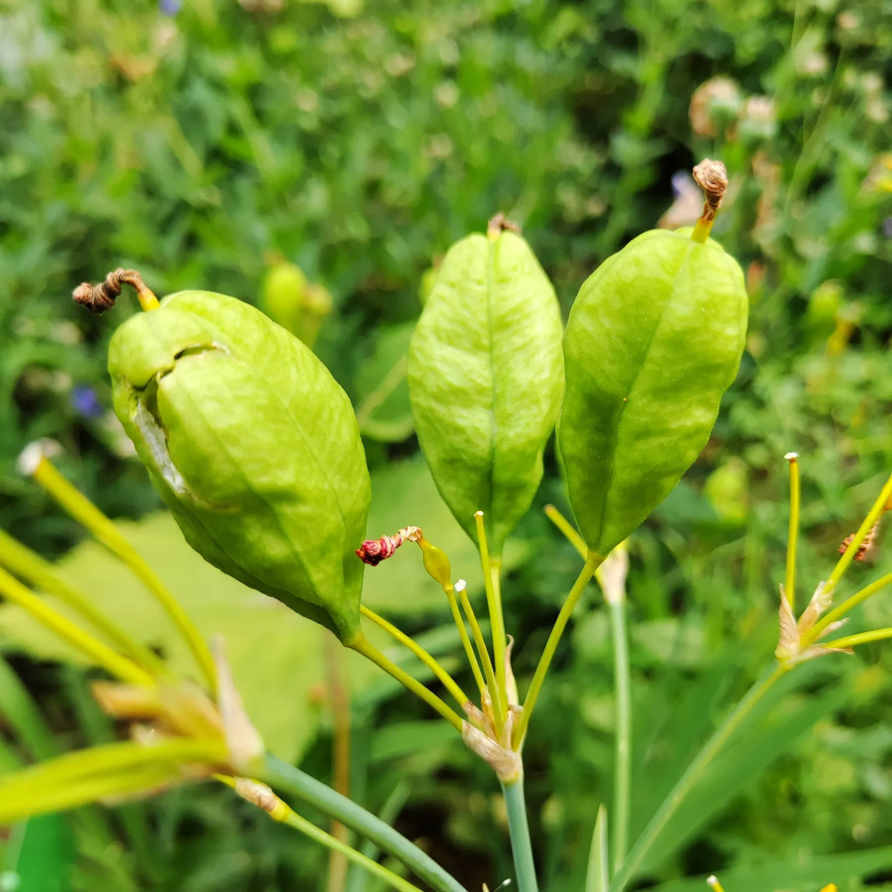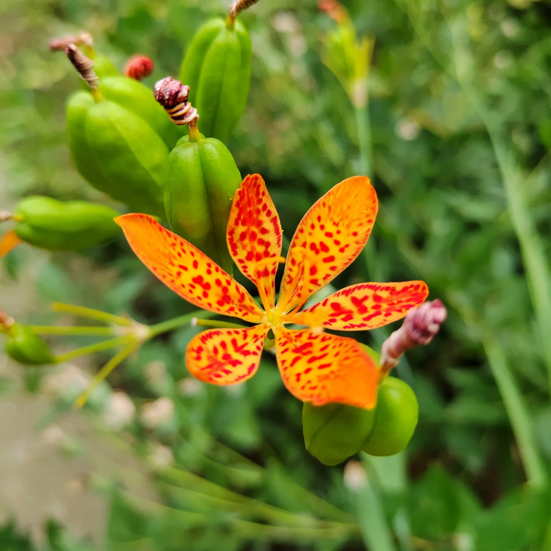 Беламканда китайская вырастает до 70 см в высоту. Имеет красивые мечевидные листья, собранные по несколько штук веером. На каждый веер приходится один цветонос. Цветки распускаются по очереди, и хотя отдельный цветок живет не более 3-4 дней, на кустике всегда имеется не меньше двух распущенных цветков. Цветки диаметром до 7 см, очень изящные, броские и яркие. Лепестки приятного насыщенно оранжевого цвета, и покрыты похожими на миниатюрные веснушки буровато-красными крапинками. После цветения также постепенно друг за другом наливаются и плоды – трехгнездные коробочки. Они, как и все в этом растении, довольно декоративны.