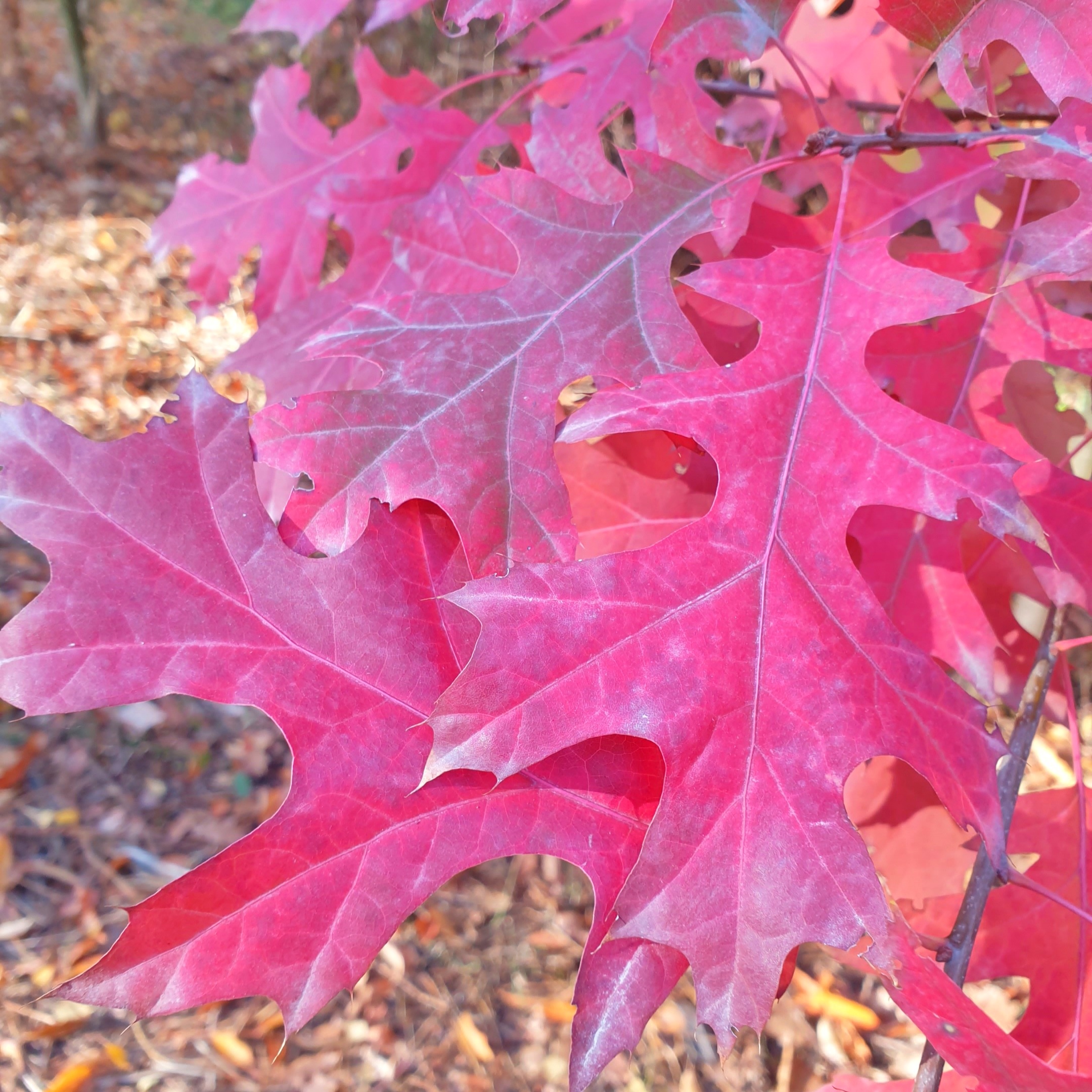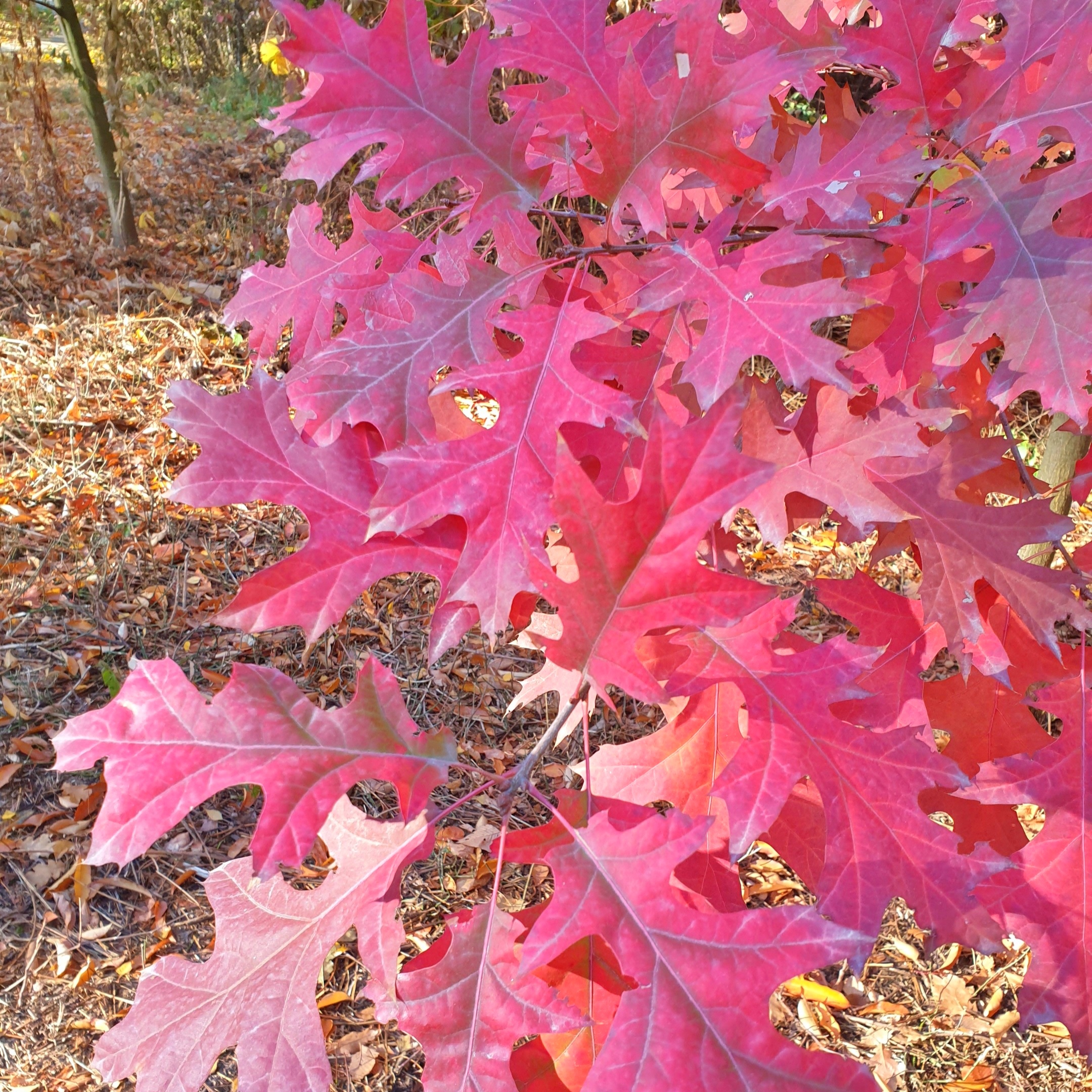 Дуб Шумарда (лат. Quercus shumardii) – дерево, вид рода Дуб (Quercus) семейства Буковые (Fagaceae). Представляет собой листопадное дерево с глубоко растрескивающейся корой. Взрослые дубы Шумарда обычно достигают высоты от 25 до 35 м, диаметр ствола составляет от 60 до 100 см, а ширина короны 12-18 м. Листья чередующиеся, эллиптические, 8-18 см в длину, до 12 см в ширину, глубоко разделенные на 5-9 лопастей с зубчатыми, слегка опушенными кончиками. В зависимости от региона произрастания, их окраска изменяется поздней осенью на коричневый и красный цвет, иногда с оттенками желтого. Например, в Техасе дубы становятся ярко-красными в начале декабря, а во Флориде меняют окраску только в феврале. У нас же дуб Шумарда окрасился в красный цвет в октябре. Плодоносить дерево начинает, не ранее достижения возраста 25 лет, а пик плодоношения дуба приходится на возраст 50 лет. Дуб Шумарда относится к долгожителям, в природе живет до 400 лет.