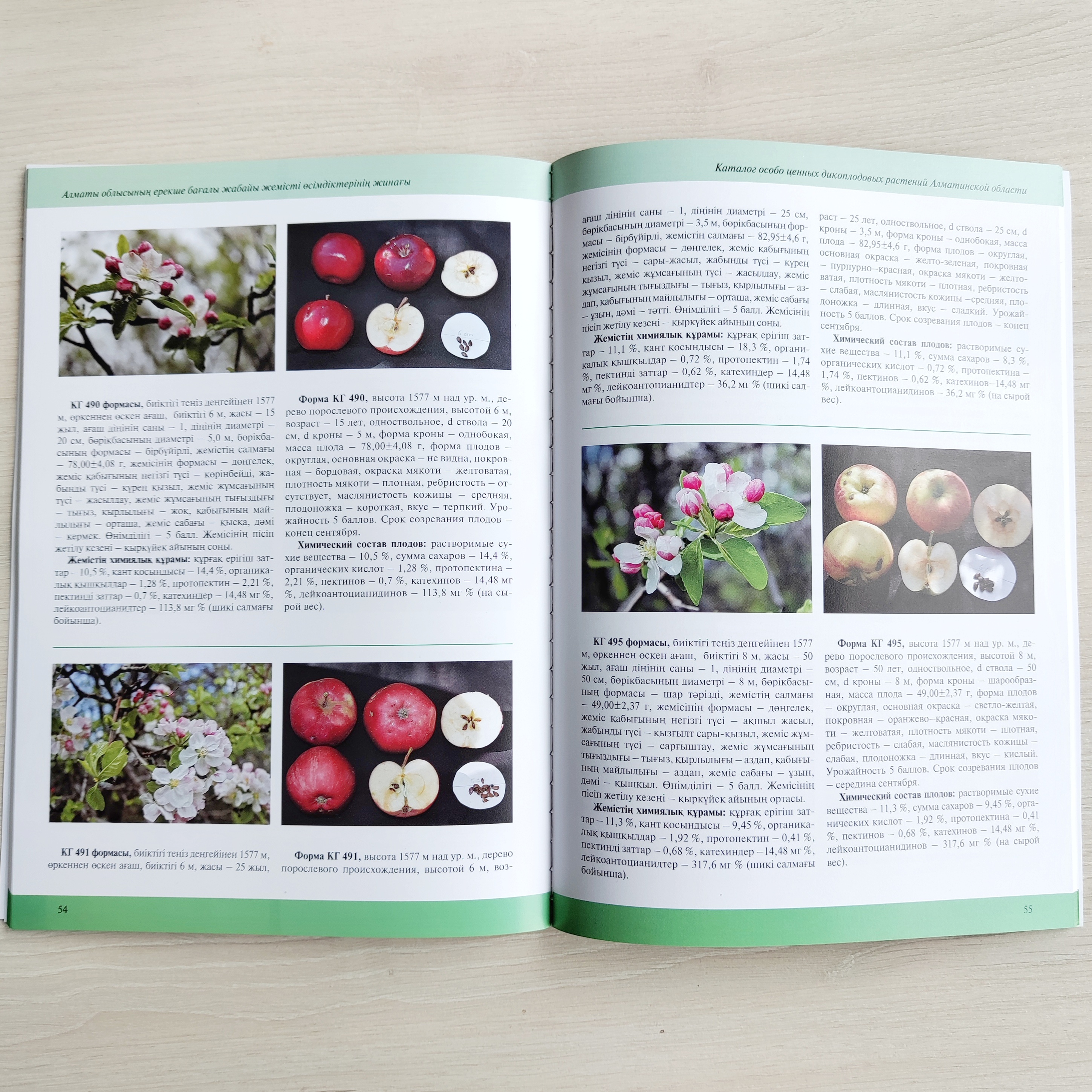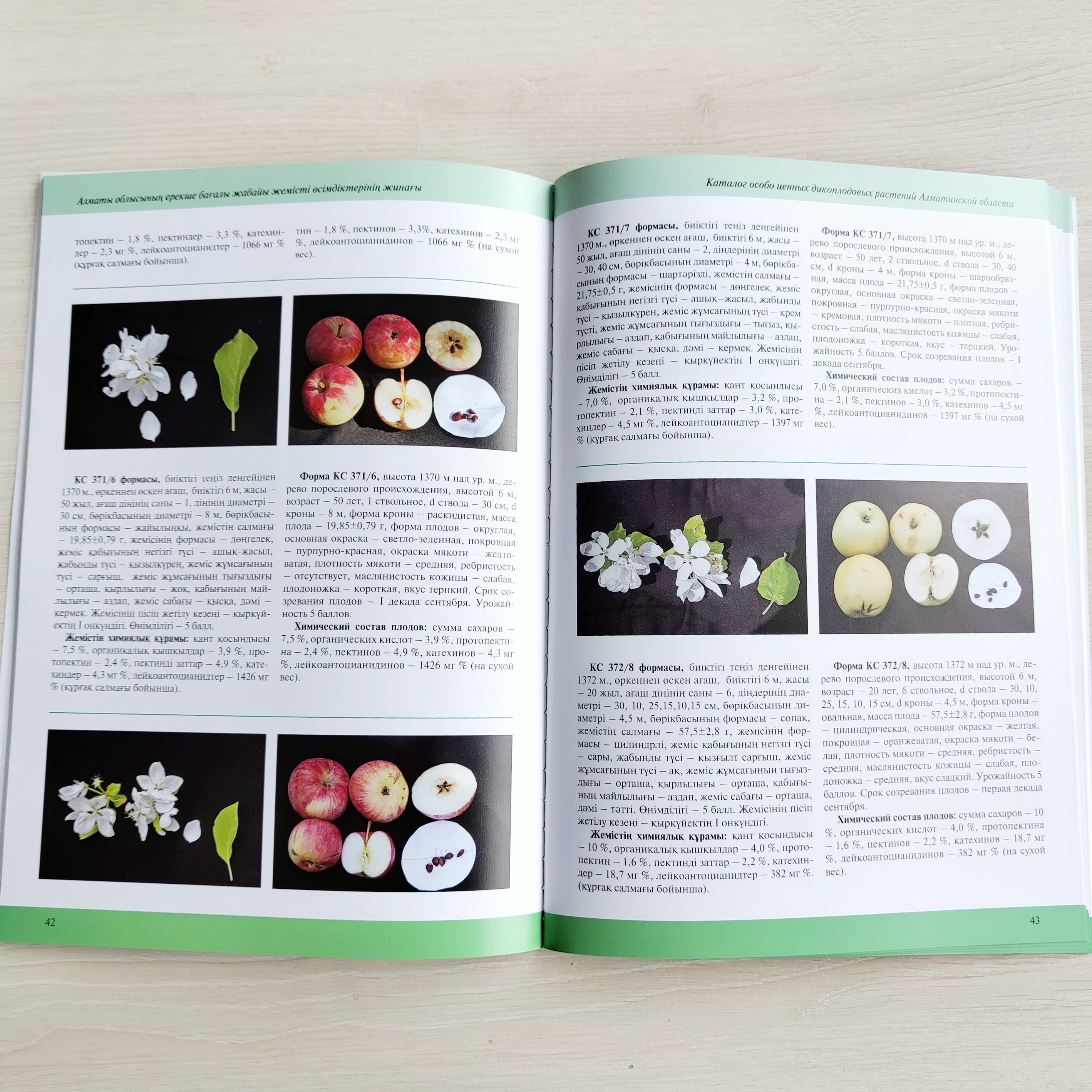 Для каждого вида приведены: название (латинское, казахское, русское), семейство, статус вида (редкий, эндемичный, официально признанный лекарственный или применяемый в народной медицине), краткое ботаническое описание, размножение, распространение по флористическим районам Казахстана, экологическая приуроченность, применение, полезные свойства, рекомендации по использованию и сохранению, список использованных источников. Для каждой формы плодового растения приведены: краткое описание природной популяции, биологические и помологические хозяйственно-ценные признаки, и свойства, также дан химический анализ плодов.