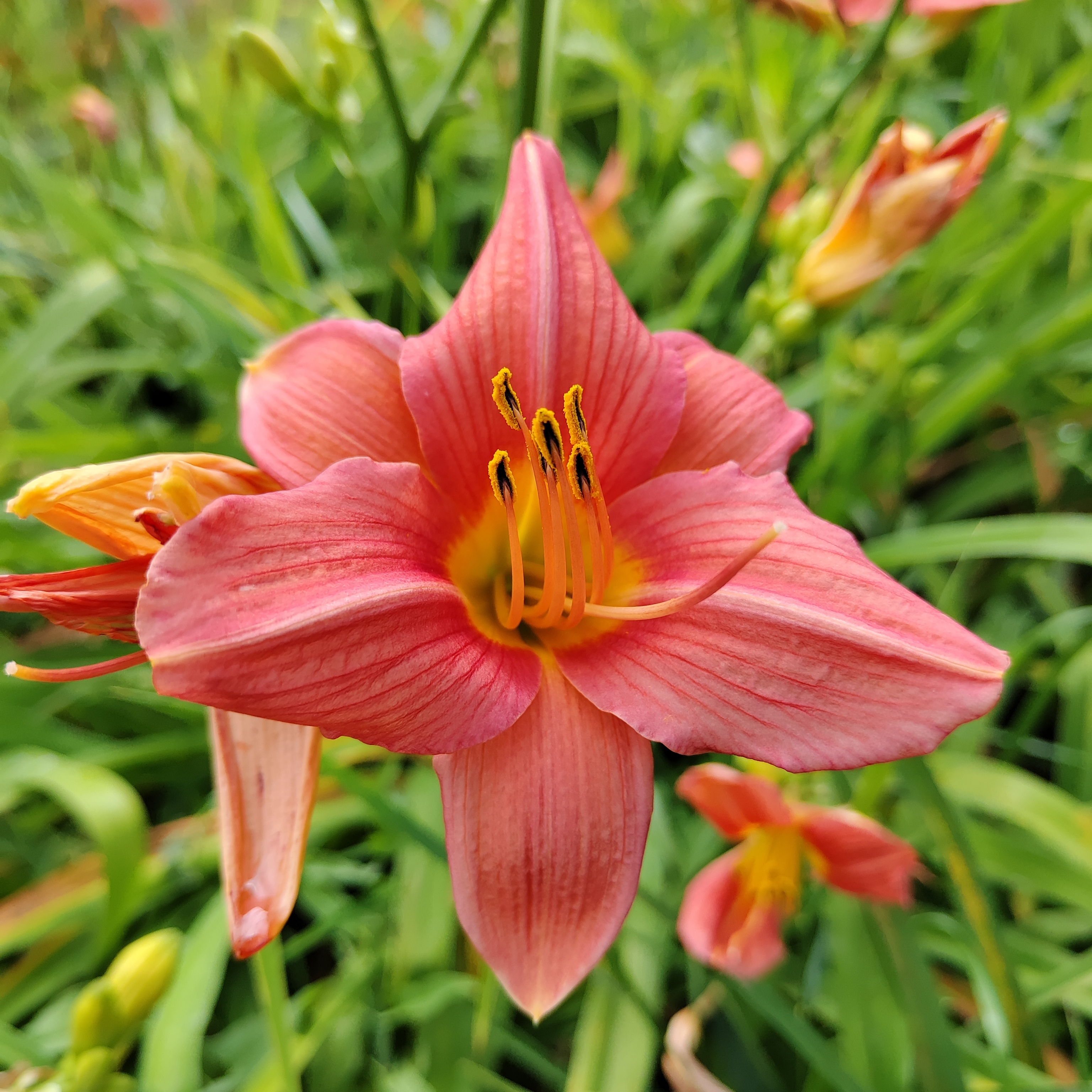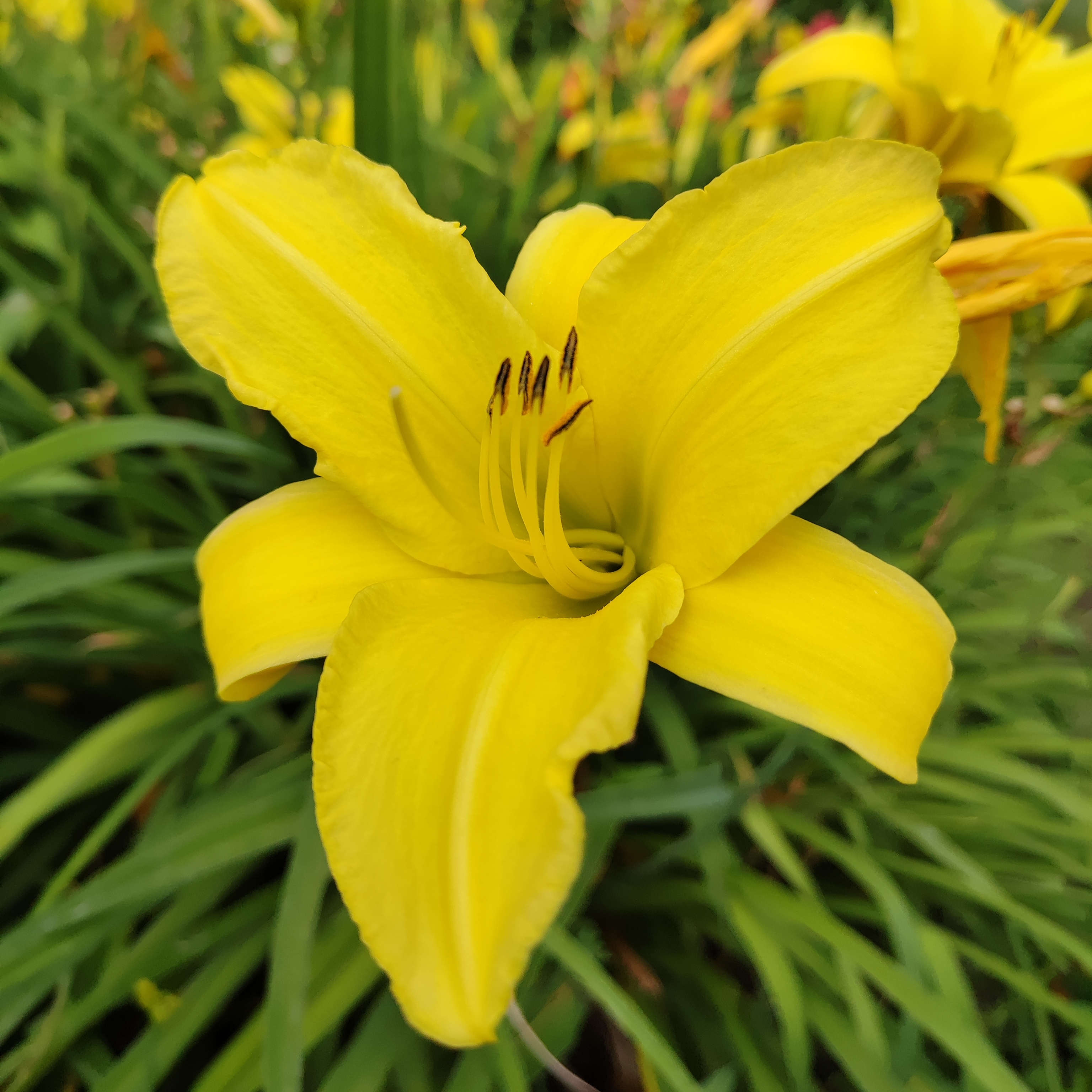 Стоит сразу упомянуть, что лилейник и лилия — это два совершенно разных растения, объединяет их только форма цветка. Лилия — это луковичное растение с прочным облиственным стеблем, на верхушке которого соцветие с крупными цветами. Каждый цветок сохраняет декоративность в течение недели, чуть дольше или чуть меньше. Лилейник — это корневищный многолетник, у него раскидистая листовая розетка, листья длинные, узкие, мечевидные, они изящно изгибаются. Цветоносы лилейника тонкие, высокие, они лишены листьев, из-за чего теряются на фоне зелени куста, кажется, будто яркие цветы парят над листвой. На каждом цветоносе закладывается от 7 до 12 бутонов, распускаются они последовательно, друг за другом, цветок раскрывается утром и цветет в течение дня, после чего увядает и опадает. Цветы крупные, до 10-12 см в диаметре. Лилейник выбрасывает цветоносы одновременно, поэтому цветение дружное, обильное, в течение 3-4 недель. Считается, что лилейник лишен аромата, однако это не всегда верно, современные сорта лилейников источают приятный ненавязчивый запах, не такой приторный и дурманящий, как у лилии.
