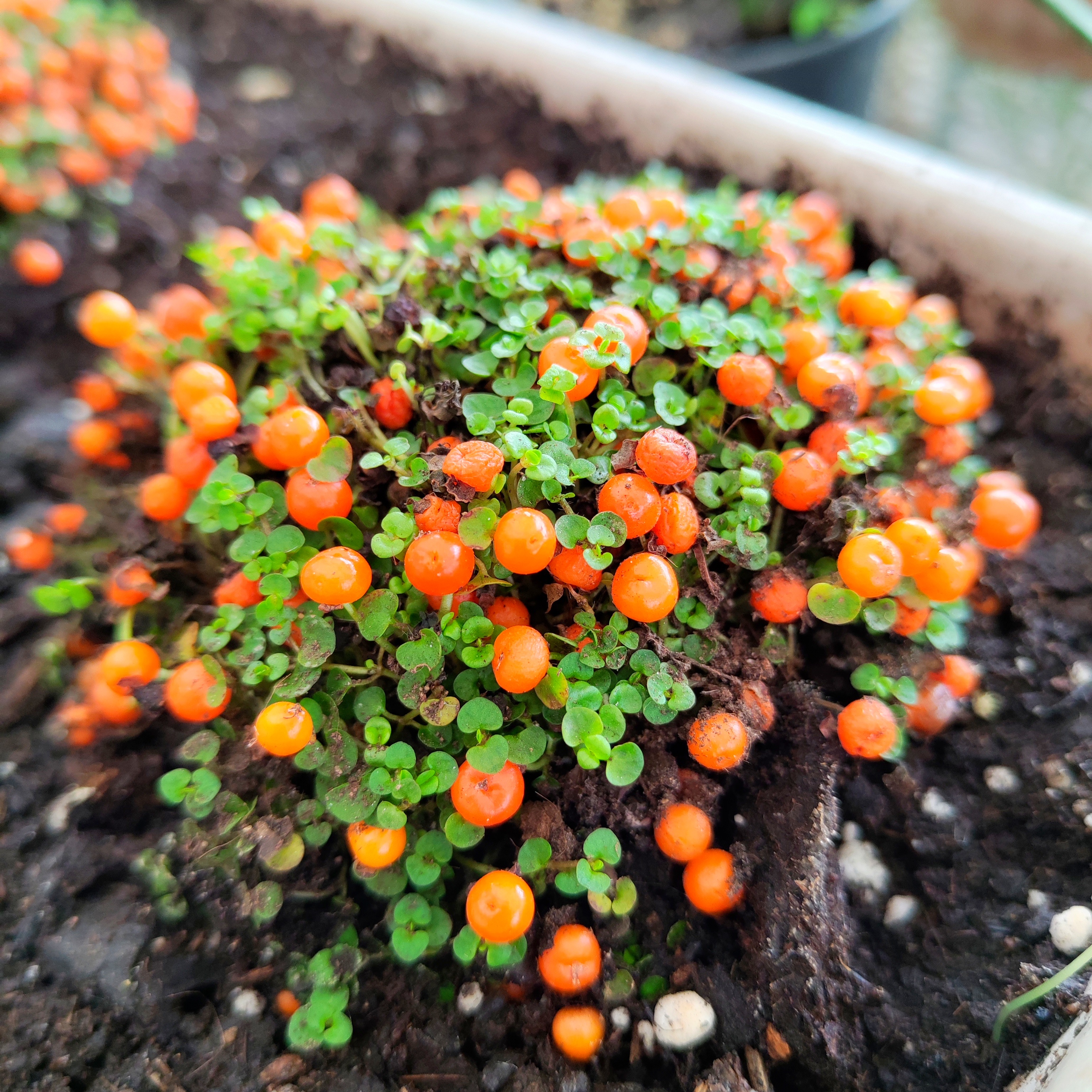 Нертера гренадская - многолетнее стелющееся растение с ползучими стеблями и мелкими округлыми листочками около 0,5 - 0,6 см в диаметре, расположенными супротивно. Высота самого растения никогда не превысит и 10 см. Цветет очень мелкими зеленовато-белыми цветочками. Главное шоу растения начинается после окончания цветения, когда на нем начинают формироваться идеально-круглые и глянцевые плоды. Пока они приобретут финальные тона, ягоды проходят трансформацию от светлейшего салатового до белого, кремового и всех мыслимых оттенков оранжевого. На растении ягоды дозревают неравномерно, и нертера фактически постоянно укрыта разноцветной россыпью плодов. Они и правда кажутся бусинами, коралловыми, яркими и нарядными. Держатся ягодки с августа и до самой зимы.