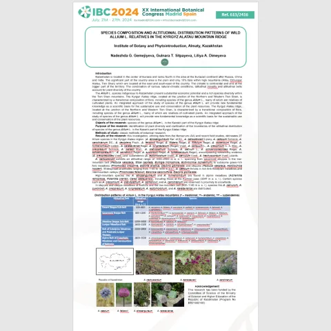 С 20 по 27 июля 2024 года ведущие сотрудники Института ботаники и фитоинтродукции: д.б.н. Димеева Л.А., д.б.н. Гемеджиева Н.Г., к.б.н. Кудабаева Г.М., к.б.н. Веселова приняли участие в работе XX международного ботанического конгресса (IBC 2024), г. Мадрид (Королевство Испания) за счет средств программно-целевого и грантового финансирования. Подробнее...