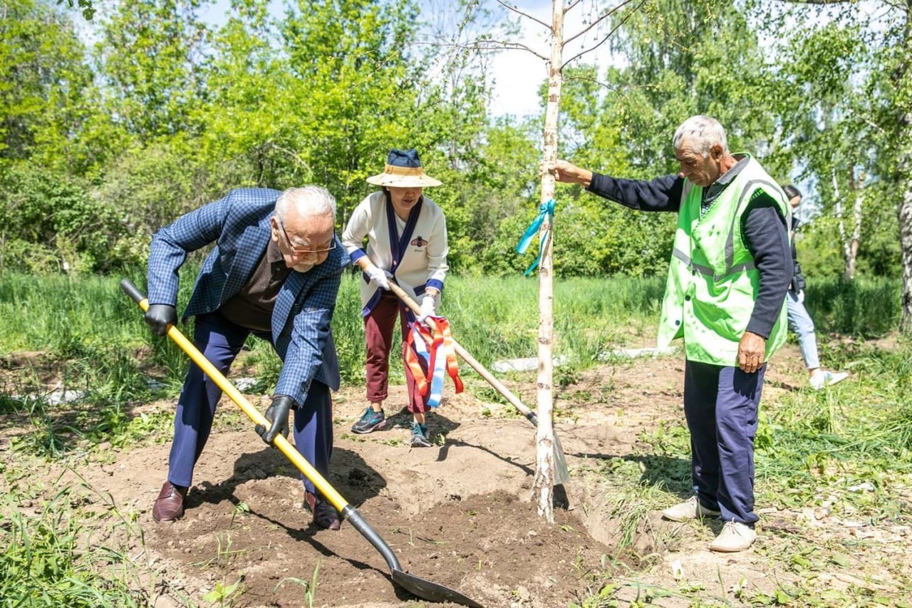 Именитые гости высадили деревья и цветы. На берёзах теперь красуются ленточки с их именами.