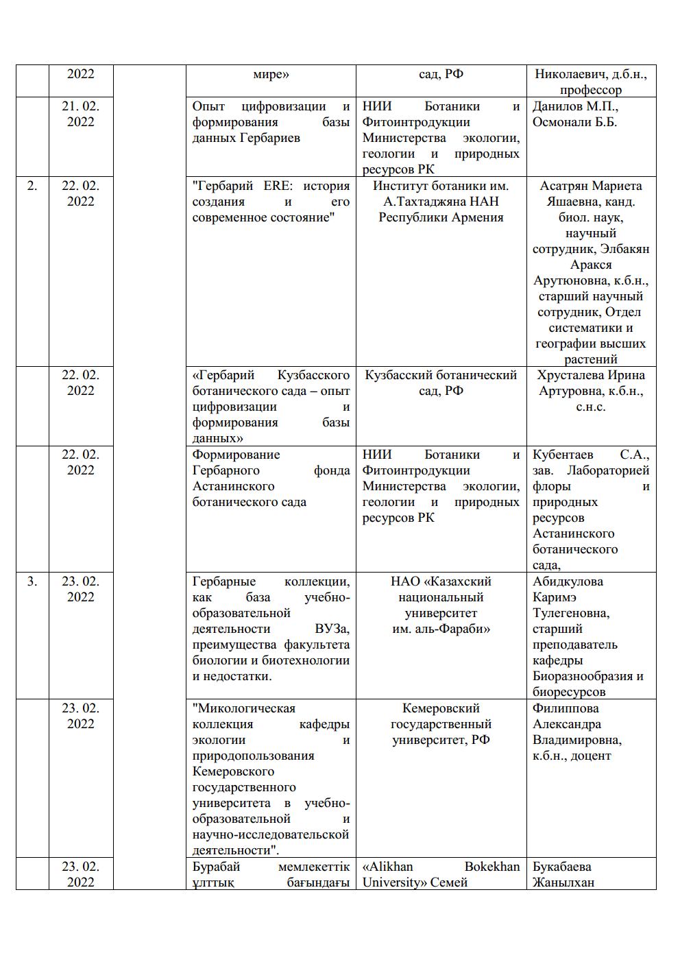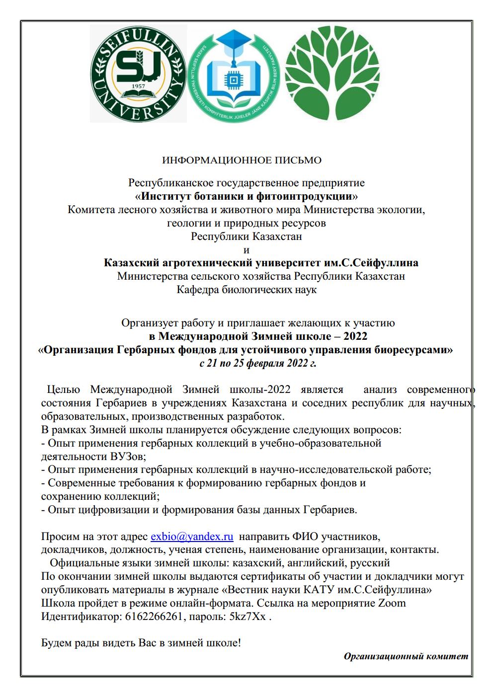 Республиканское государственное предприятие «Институт ботаники и фитоинтродукции» Комитета лесного хозяйства и животного мира Министерства экологии, геологии и природных ресурсов Республики Казахстан и Казахский агротехнический университет им. С.Сейфуллина Министерства сельского хозяйства Республики Казахстан Кафедра биологических наук организует работу и приглашает желающих к участию в Международной Зимней школе – 2022 «Организация Гербарных фондов для устойчивого управления биоресурсами» с 21 по 25 февраля 2022 г. Подробнее...