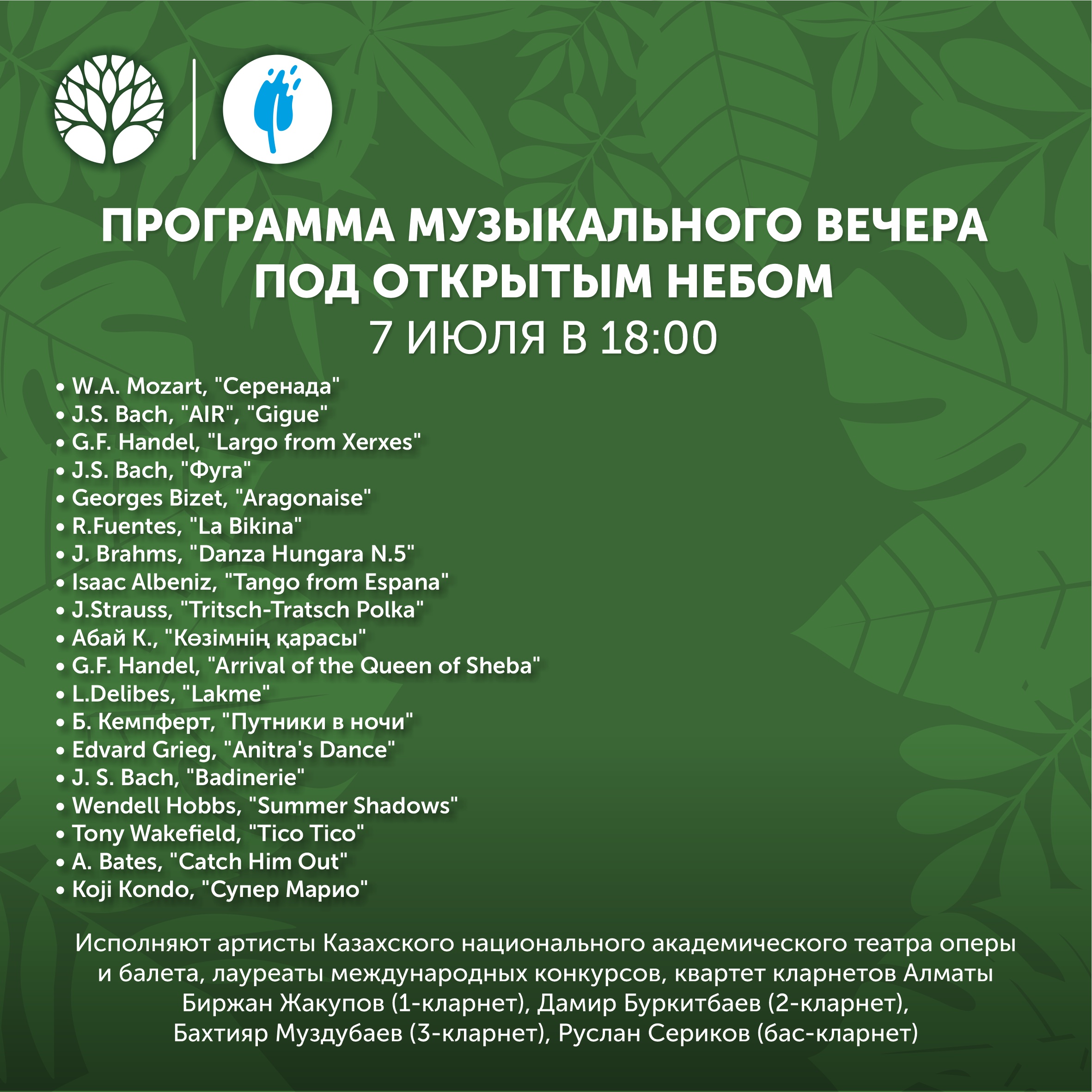 18:00 – концерт классической музыки в исполнении артистов Казахского национального академического театра оперы и балета им.Абая, лауреатов международных конкурсов, квартета кларнетов Алматы в составе: Биржан Жакупов (1-кларнет), Дамир Буркитбаев (2-кларнет), Бахтияр Муздубаев (3-кларнет), Руслан Сериков (бас-кларнет).