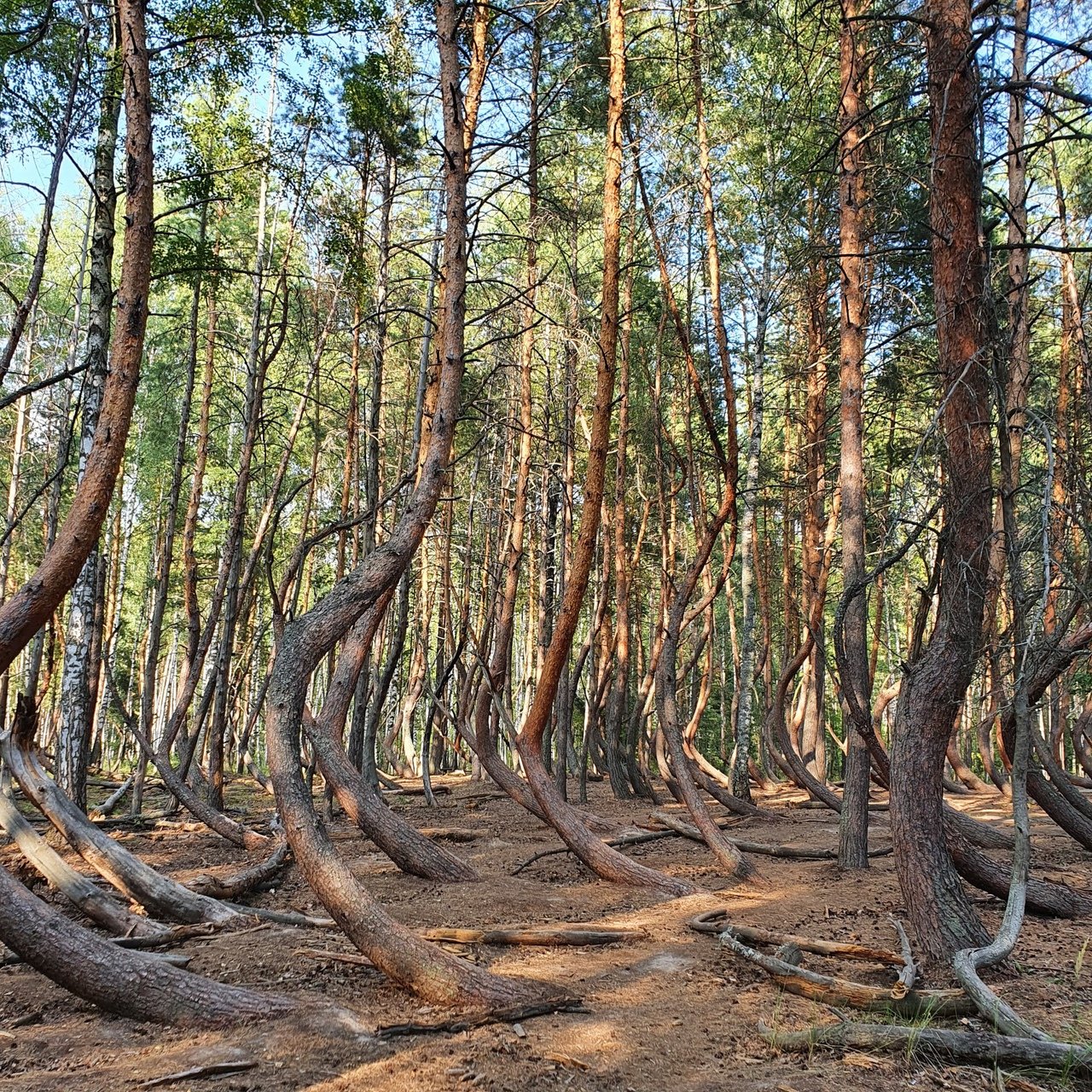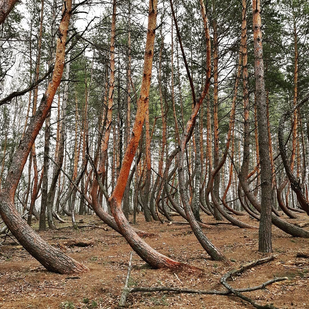 Пьяные леса также часто называют танцующими. Один из таких лесов находится в Калининградской области в России. Этот лес состоит из наклоненных и изогнутых сосен. Мнения ботаников о причинах возникновения в этом лесу искривления стволов сосен разнятся. Называют особенности геомагнитных полей, сильный ветер в разных направлениях, повреждение молодых сосен гусеницами бабочки побеговьюна зимующего. Гусеницы повреждают сосновые побеги, поедая развивающиеся верхушечные и, в меньшей степени, боковые почки. После уничтожения верхушечной почки происходит дальнейший рост дерева за счет боковой почки в качестве основной. Вследствие этого при дальнейшем росте происходит деформация ствола, и дерево приобретает необычную форму. Некоторые люди связывает необычный рост деревьев с мистикой и утверждают, что в пьяном лесу особая энергетика. Какая бы ни была причина, пьяные или танцующие леса привлекают туристов, поэтому природоохранным организациям приходится прилагать огромные усилия, чтобы деревья не были уничтожены.