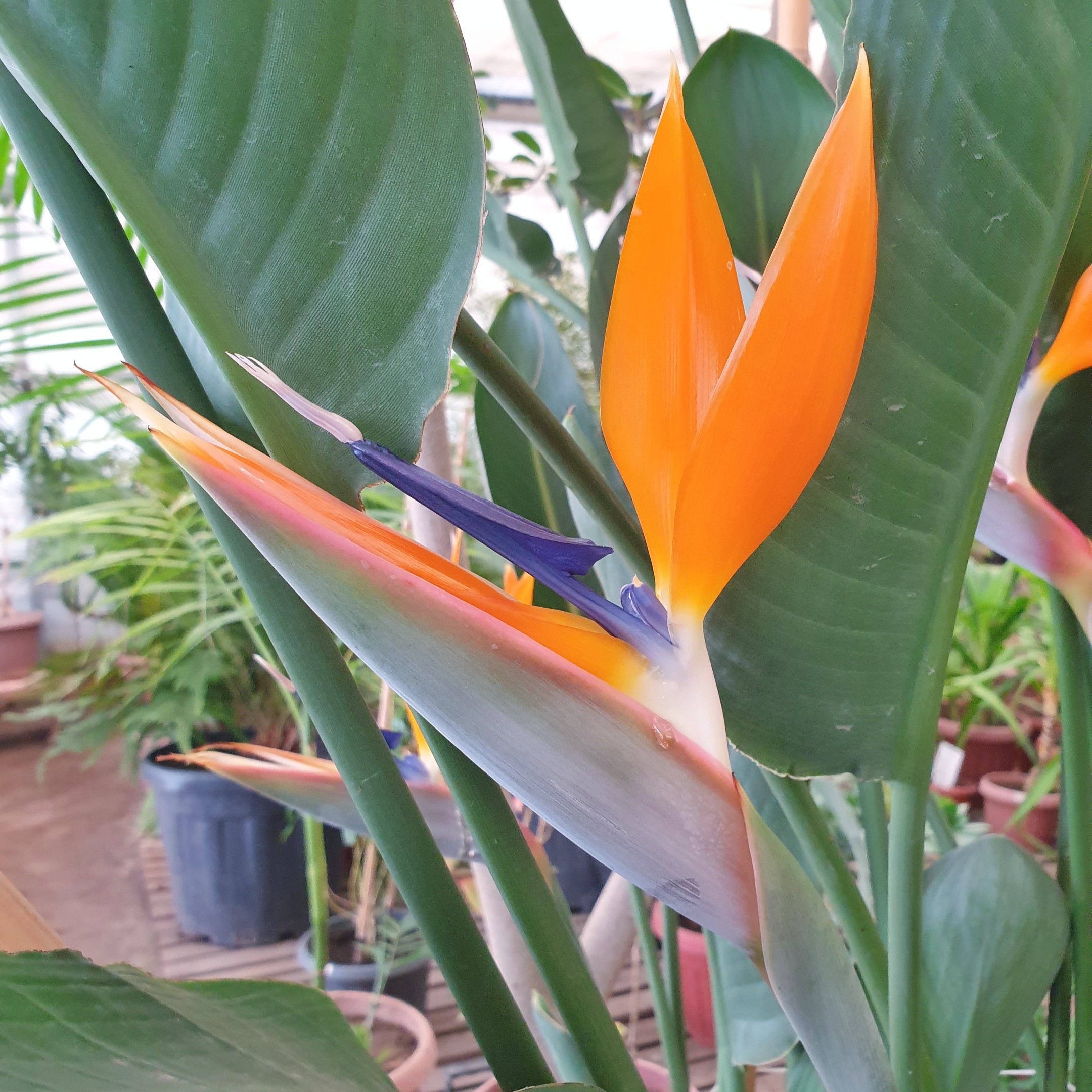 Листья на длинных крепких черешках, кожистые, зеленые с легким серо-голубым налетом. Листва овально вытянутая, слегка заостренная на концах. Иногда, кажется, что стрелиция плачет – под «клювом» выступают маленькие капельки смолистой влаги. Это приманка для птиц, которые становятся опылителями. Срезанные цветы при правильном уходе могут долго стоять в букете — от двух до четырех недель. Причем цветы в букете стоят дольше, чем на ветке.