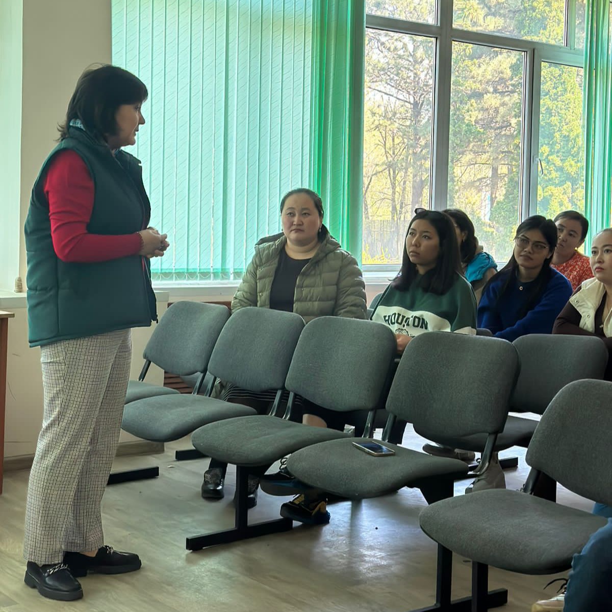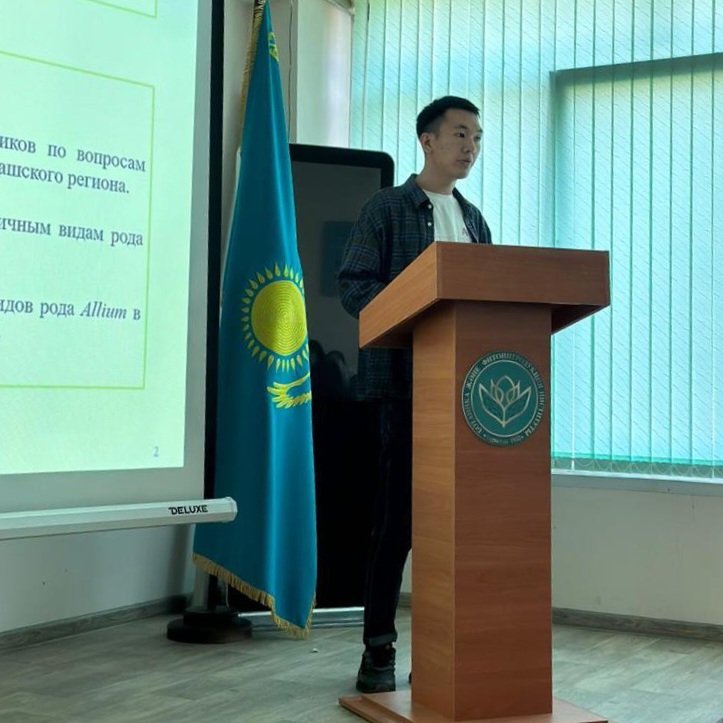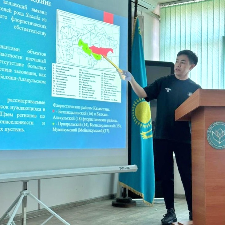 Перед молодыми учеными института выступили магистранты лаборатории высших растений Үсен Серикбай с презентацией на тему: "Представленность рода SUAEDA FORSSK. EX J.F. GMEL флоры Арало-Балхашского региона в коллекциях гербария ГосНПЦзем", а также Абдилданов Даулет на тему: "Редкие, эндемичные виды рода allium l. во флоре Арало-Балхашского региона".